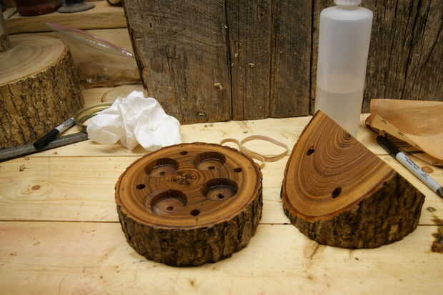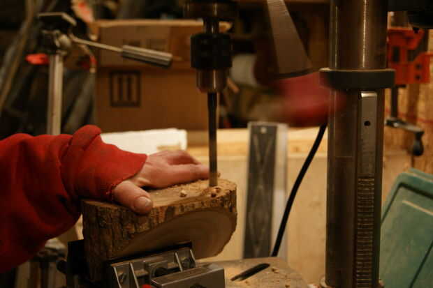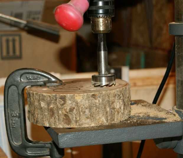 Sujetar el alimentador para un taladro de columna para sostener la base constante. Si no tienes una prensa del taladro, que alguien Ayude a sostener el tronco para que no se mueva durante la perforación. Usando un pedacito de forstner o pala, taladro la semilla tazas aproximadamente 3/4" a 1" de profundidad.