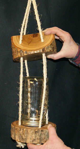 Corte cuatro longitudes iguales de cuerda un poco más largo que se necesita. Creo que la mía fueron unos 3', pero podrían haber sacado con 2-1/2'. Asegúrese de cortar el tiempo suficiente para que el techo se deslizan hasta unas pocas pulgadas para retirar la jarra al llenar. Un nudo en un extremo de cada cuerda. Utilice una pistola de pegamento caliente para poner unos toques de pegamento en el nudo para evitar que se afloje. Recorte los extremos del fondo para la igualdad de longitud y batalla la cuerda si se desea hacer una borla.