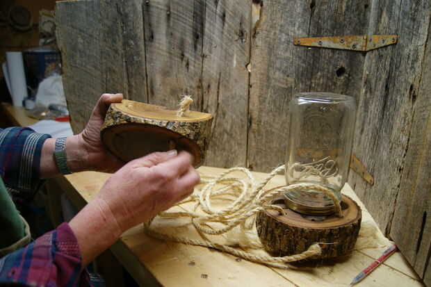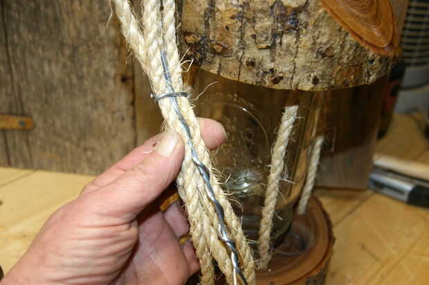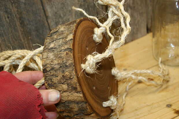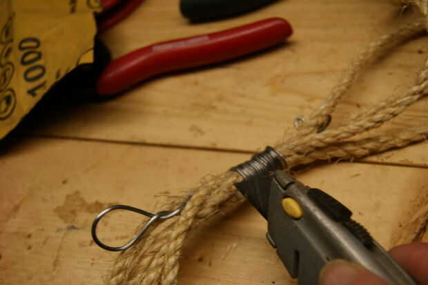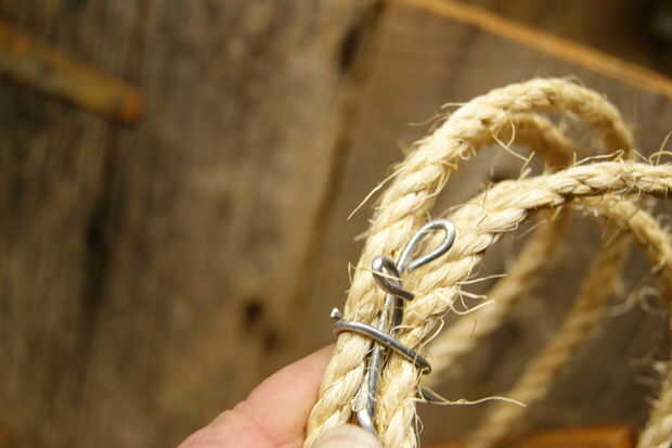 - Aplique pegamento caliente en los extremos cortados de la cuerda. Esto ayudará a arrojar agua y asegure el gancho. El yute es una cuerda natural y será el tiempo en el tiempo al igual que la madera.