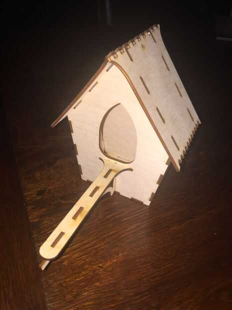 lo primero que hice fue imprimir una pajarera de triplex. Yo buscaba en thingiverse para una pajarera y la encontré. Lo único que tuve que hacer fue descargar y tuvo que poner en una USB por lo que podría establecer el archivo en el equipo que estaba conectado con el lasercutter. Tuve que ajustar los parámetros de mi archivo, así que estaba listo para ser printend. El cuadro era mi resultado final. La primera vez que estaba tratando de cortarlo fue un poco mal porque la madera se doble, por lo que el láser no podía ir limpio a través.
