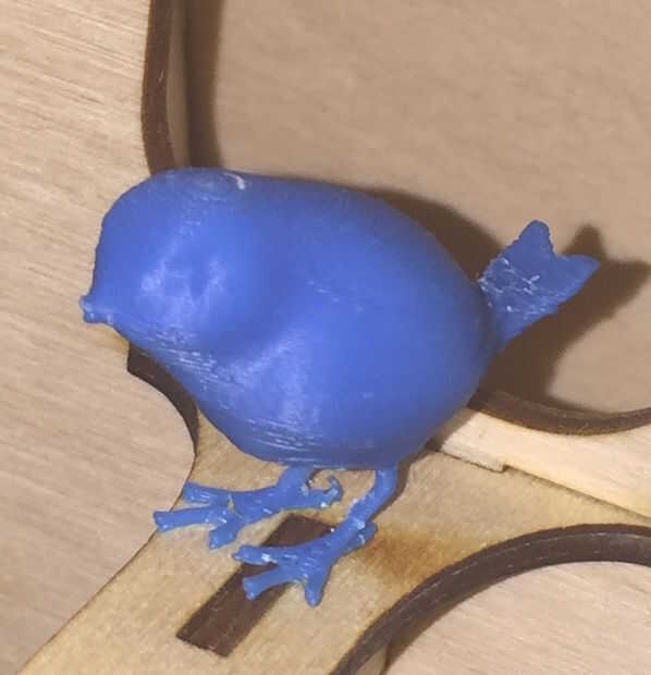 El pájaro era también muy simple. He descargado un archivo en thingiverse y ponen en un USB, así que pude fijar en computadora te que es conectada con la impresora 3D. Así que comenzó a imprimir y después de 40 minutos fue realizado. Lo único que tenía que hacer era conseguir rit de a las construcciones de apoyo. Tienes que hacerlo con mucho cuidado porque las patas de las aves son muy delgadas y fácilmente romper por el mal se moverían. Las piernas de mi pájaro rompieron ambos pero pude solucionarlo con un poco de pegamento. Espero que no rompa otra vez.