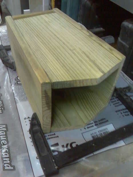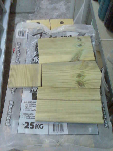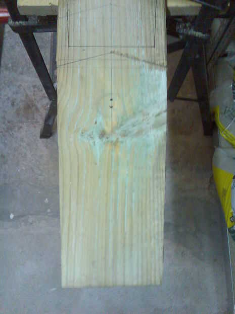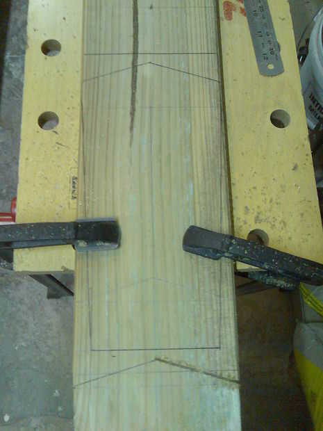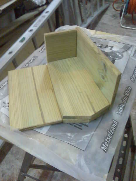 En primer lugar medir, mida nuevamente, sacar todo de la madera y salir de la sierra. Elegí el ángulo de la azotea para ser 15 grados. Esto era más fácil para mí, puesto que mi sierra (potencia) podría ajustarse también a la sierra a 15 grados. Cuando todo fue aserrado, había lijado todo y cupo un sendero con una abrazadera.
