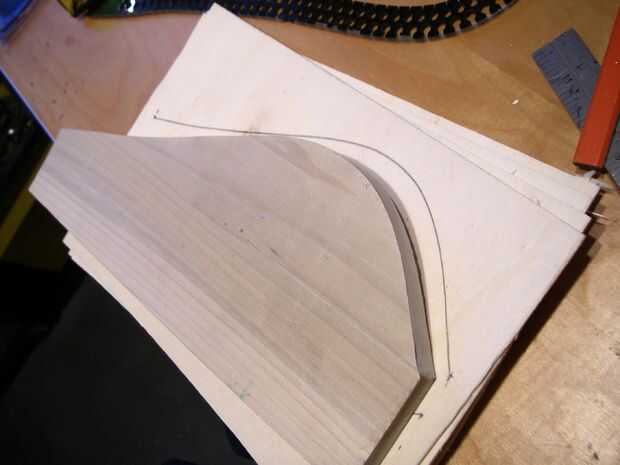 La inspiración para el diseño de la pajarera vino de una forma del ala que tenía en mi mente. Utilicé una herramienta curva para conseguir la forma quería y cortar un trozo de madera para trazar la línea de las piezas de madera contrachapada del álamo. Las líneas fueron dibujadas por lo que pararon 1/2" de los extremos de la madera contrachapada y se reflejaban a través del eje de la pieza está una pulgada en los extremos. Otros cortes similares pueden trabajar y usted puede experimentar con el diseño. El techo y el pedazo de piso se dibujan hacia fuera de la misma manera exacta.