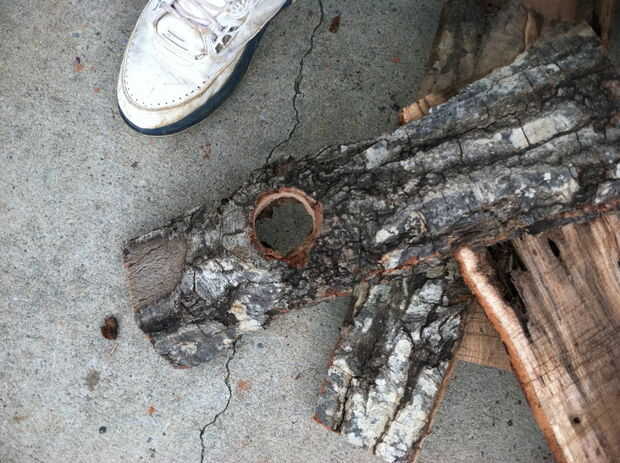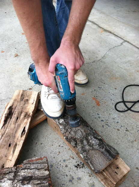 Para este paso necesitarás usar el taladro para hacer un pequeño círculo sobre 2inches amplia, en lo que es ser el frente de la pajarera.  He utilizado un nudo en la madera por lo que parece natural.  Hice mis 6 pulgadas desde la parte superior de la pajarera.