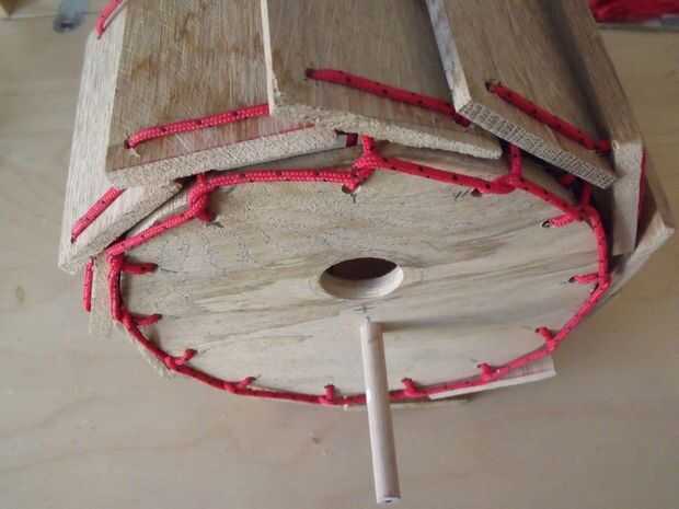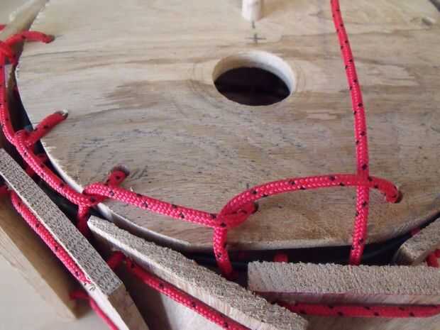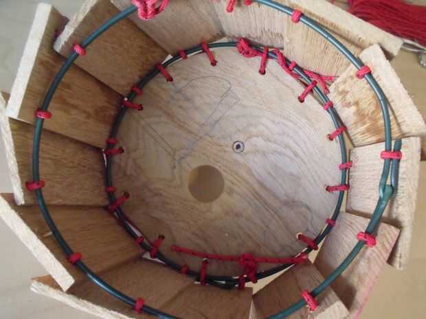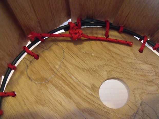 Utilicé de una puntada de manta para sujetar la parte frontal. Empezar con un trozo de cable y punto a través de uno de los orificios de la parte delantera. Subir alrededor del alambre de metal del círculo y tire entre lateral y tablero frontal. Repetir con todo agujero en la parte delantera, asegurándose de que el cable cruza la última puntada cada vez. Terminar con un nudo en el interior.