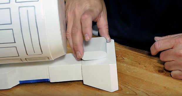 Después de ver algunas fotos más de R2-D2, me di cuenta de que tiene los paquetes de energía en sus pies. En forma de un pequeño bloque para cada pata y había pintado de blanco, luego había pegado en. He añadido características de chrome de som. También algunos agujeros poco profundos perforados y pegado en algún cordón collar bronce como cables de alimentación.