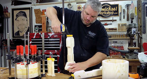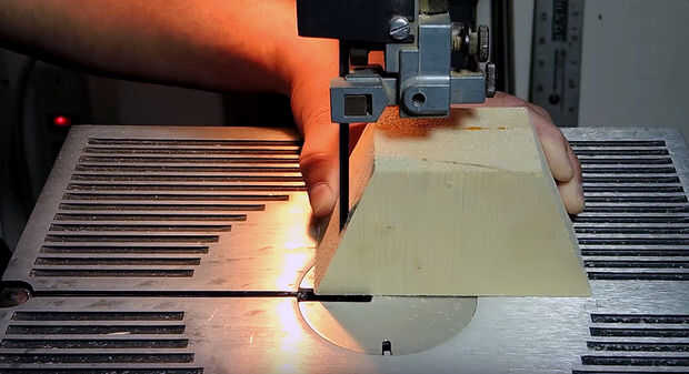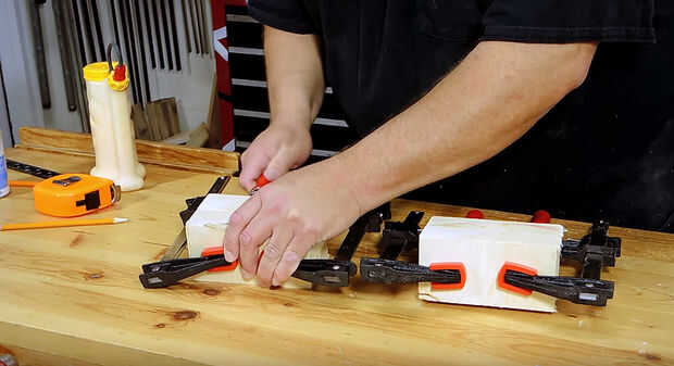 Pegamento de dos bloques de material x 2 para los pies. Inclinar la mesa de la sierra y cortar los lados para darles forma como pies de R2. Pegarlos en la parte inferior de las piernas.