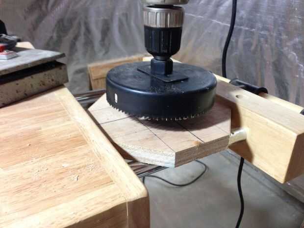 Corte un orificio de 5" de diámetro (o un tamaño para que coincida con tu luz) en uno de los octágonos con la sierra cilíndrica.