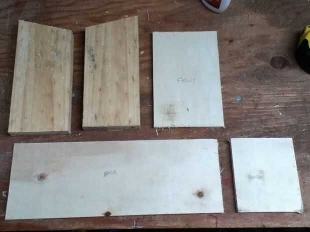 Usé la Junta gruesa plataforma de 1" para los lados. El resto de las piezas fueron cortados de madera contrachapada de 3/8" en estas dimensiones: