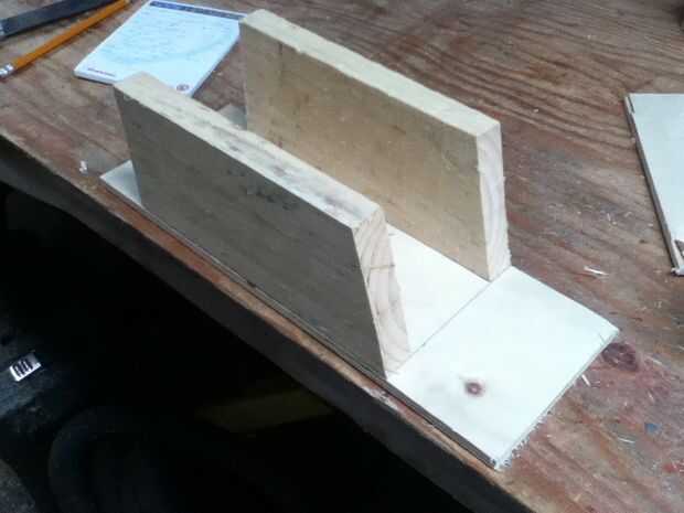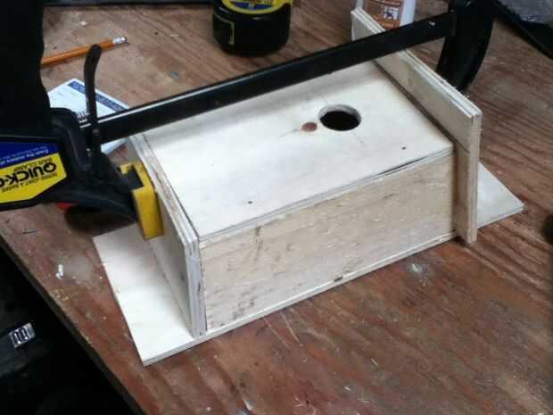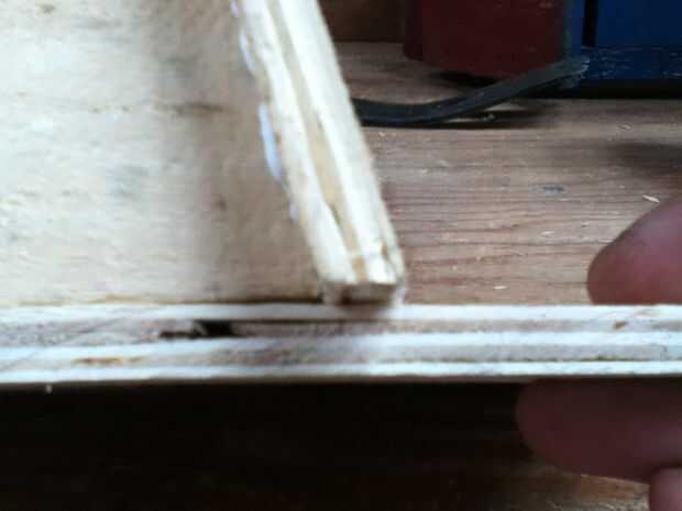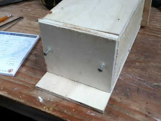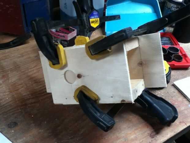 4) Retire las abrazaderas y coloque el tablero superior con pegamento y 4 clavos. Asegúrese de que el ángulo de 15 grados es en el lugar correcto (ver imagen)