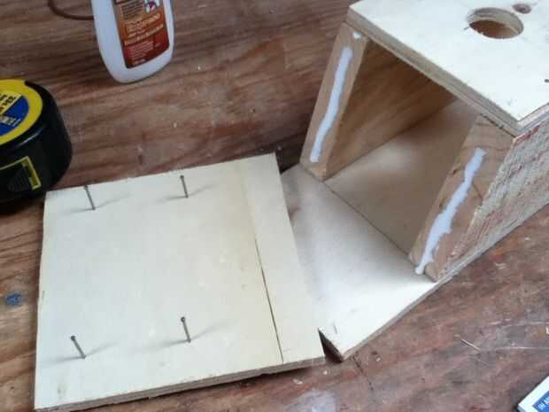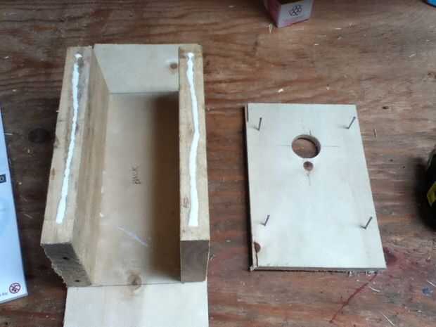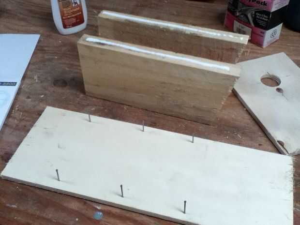 2) Conecte el tablero frontal de la misma manera con 4 clavos y el pegamento para madera