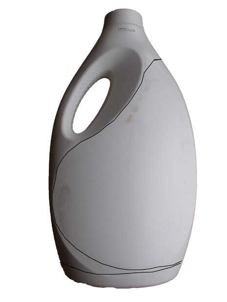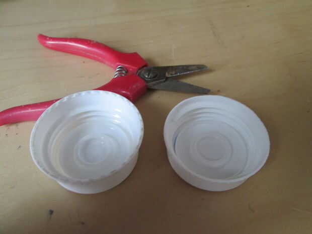 Corte de la parte inferior de la segunda botella con las tijeras (pesados). Marcar un círculo ajuste alrededor del cuello de la primera botella y recortarlo. Asegúrese de que se ajusta alrededor del cuello. Corte una forma de luna en la parte restante de la parte inferior de la botella.