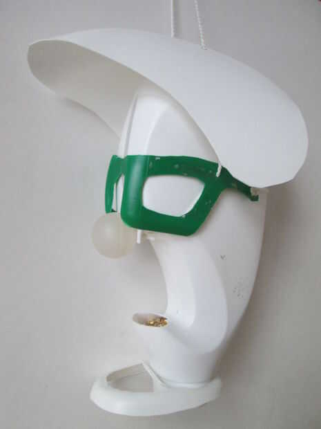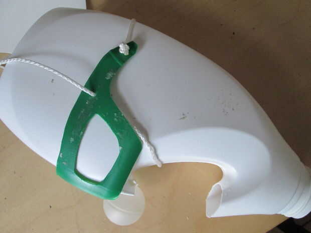 Pisar un trozo de cable a través de los mediados agujeros en los vidrios y tire del lazo debajo de la nariz. Cuando los extremos de la cuerda, la botella debe permanecer en posición vertical.