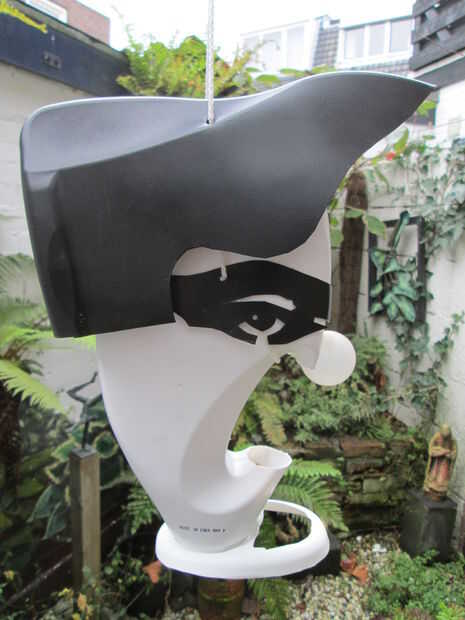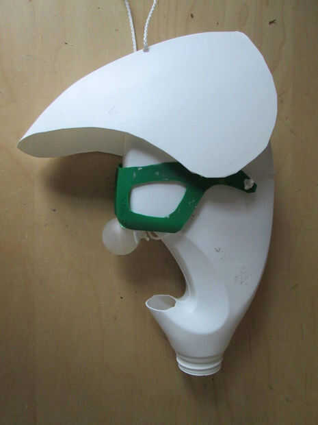 Con la parte inferior de la botella de segundo corte, es fácil de cortar la forma del casco con un par de tijeras. Siga la línea en la fotografía. Perfore dos agujeros en medio del lado superior y a través de la línea de suspensión. El nudo se puede ocultar bajo el casco.