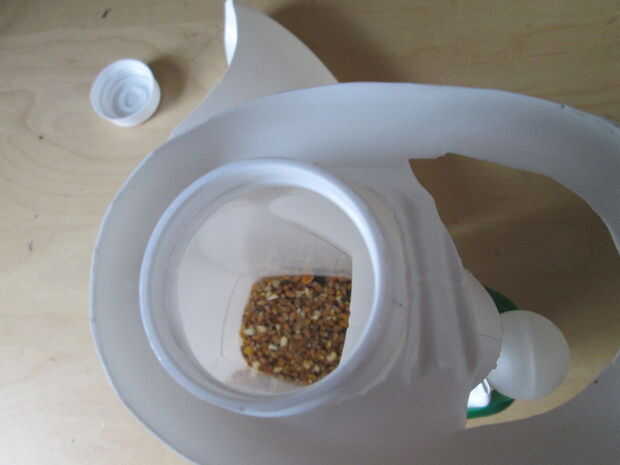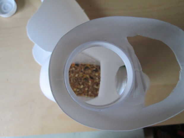 Comedero para pájaros construida reciclado de objetos:Botella de 2L popTapa de tina de helado de 2Ltornillo de la cubierta 1 pulgadaenvases de plástico de bombilla circularalambre1. en la parte inferior de la botella, cortar pequeños agujeros de tama