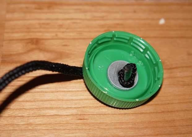 a) hacer un agujero en la parte superior de la tapa de la botella.  Que sea lo suficientemente grande para poder montar el cordón de zapato a través de él.