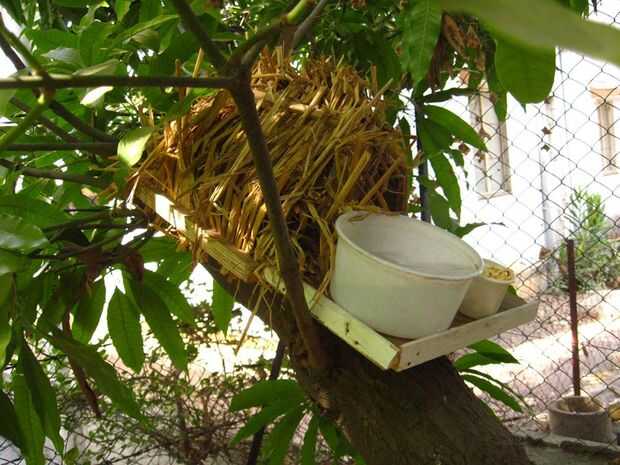 El conjunto completo se fija en un árbol de mango por dos tornillos