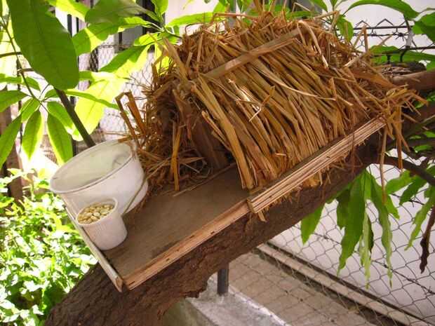 2) construir una pequeña choza de chatarra piezas de contrachapado y seca hierba (arroz)