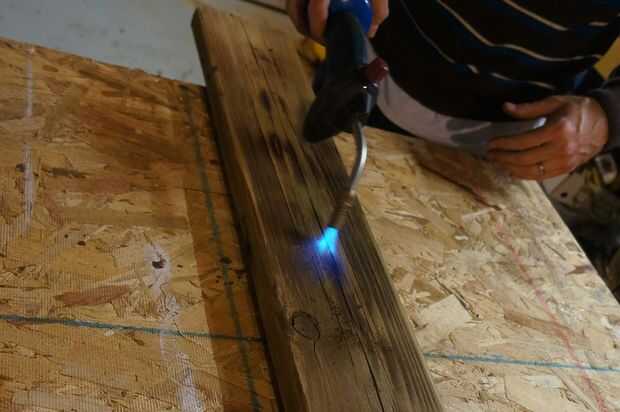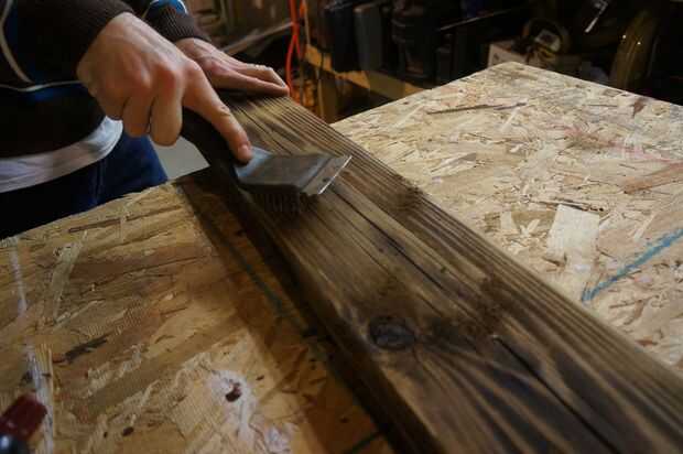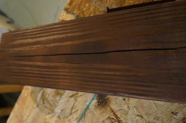 - A textura de la madera, "flameado" él. Flamear la madera significa tomar una antorcha, haz agradable y carbonizados, luego restriegue para sacar las fibras de madera carbonizadas para profundizar en el grano de madera. He utilizado este método en mis piernas de la tabla.