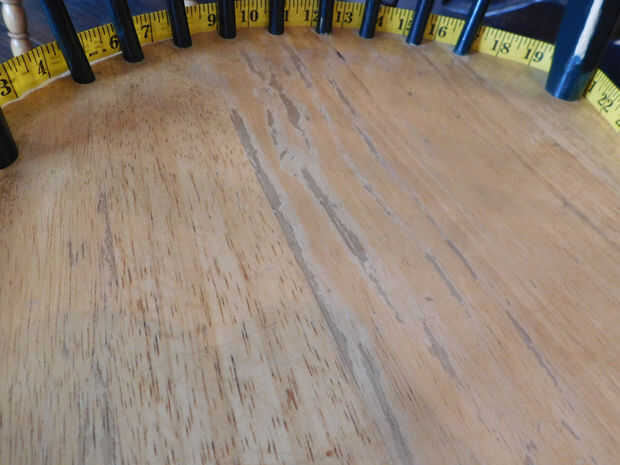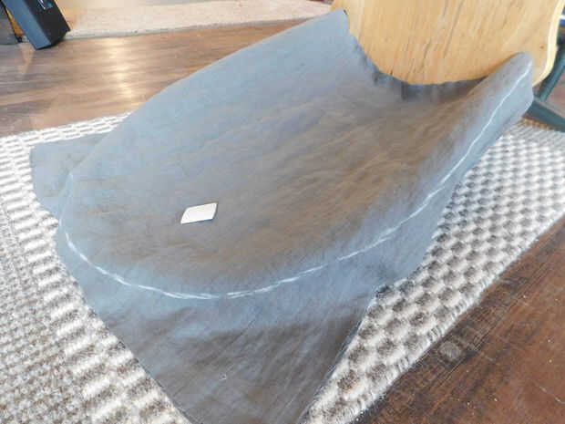 c. colocar la silla y colocar las 2 piezas sobre silla detrás. Tiza la línea de costura por sentir los bordes del centro con los dedos. Traer la pieza de superficie plana y cortar alrededor de chalkline, agregando 5/8" para el margen de costura. Doblar por la mitad para comprobar la simetría y hacer ajustes menores. (fotos 5-8)