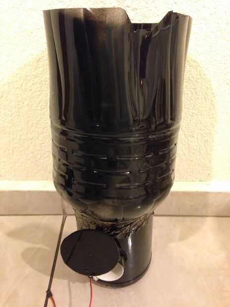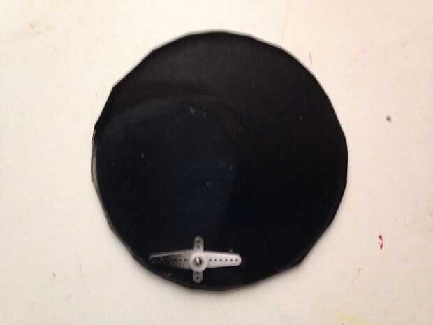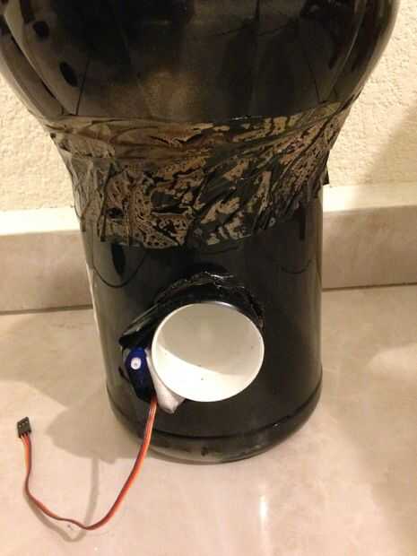 1. Al lado de la parte exterior del codo PVC, fijar el servo motor al lado de él con silicon caliente y tap.