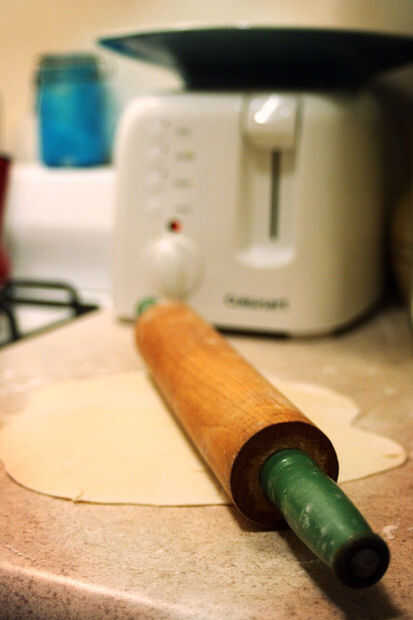 Luego tome su pin, (no importa cómo retro parece,) y estirar sus empanadas en rondas de 8", a partir del centro y moverse hacia fuera. Esto puede tomar algo de práctica, pero si tus tortillas no redondos, realmente, a nadie le importa. Sólo van a estar impresionado lo suficiente por tus emprendimientos culinarios locos en primer lugar. Cegado por la luz de su experiencia, incluso.