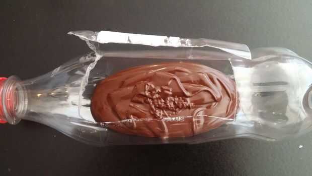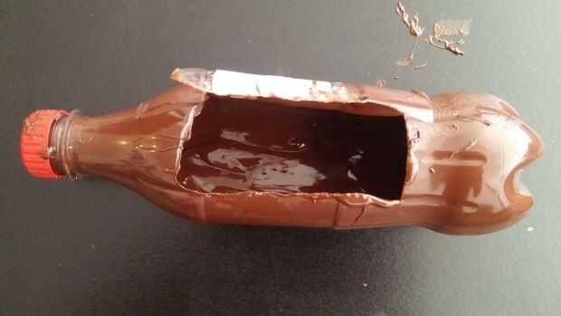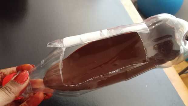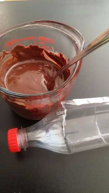 Vierta más derretido chocolate (reserva unas 4 cucharadas de chocolate derretido para cubrir encima del rectángulo de área de corte) en la botella y asegúrese de que cubrió bien dentro de la botella.