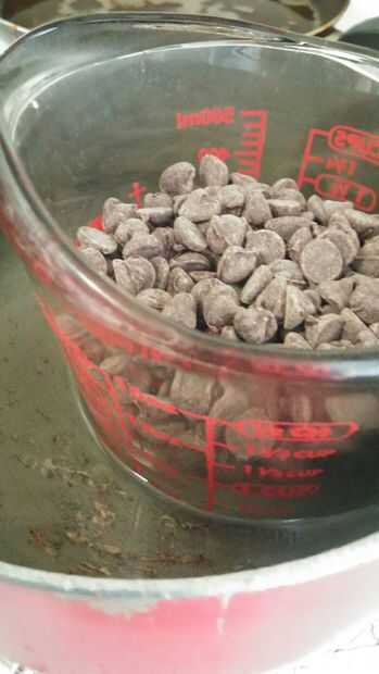En una cacerola pequeña, agregar aproximadamente una pulgada de agua y llevarlo a fuego lento. Colocar una pequeña placa sobre la cacerola y añadir trocitos de chocolate, cocinar hasta que el chocolate se derrite.