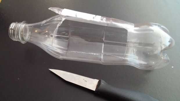 Cortar la botella en forma de rectángulo sobre un lado (véase el cuadro) con navaja o cuchillo.