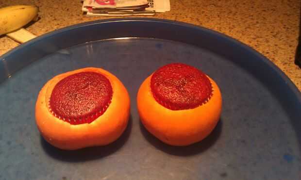 Esta parte es casi tan simple como suena. Coloque sus magdalenas refrigerados en a calabaza ahuecada hacia fuera. En mi caso, los cupcakes no eran bastante altos, así que corte el tallo de las calabaza tapas, luego coloca la tapa en la calabaza, luego ajuste el cupcake en la parte superior. Esto trajo la Magdalena a la altura correcta.