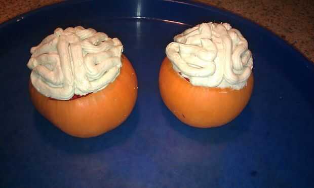 Finalmente en el cerebro. Yo primero la Lomita una buena cantidad de hielo en el Magdalena para darle altura, quiero mi cerebro para ser agradable y redondo y regordete (a nadie le gusta comer un cerebro plano caído!) Entonces I servicio a la formación de hielo en una línea continua, pensando como un brian, asegurándose de que hice un cerebro izquierdo y cerebro derecho, por lo que parecía tan real como sea posible (quería que parecen cerebros, no como la calabaza tuvo una mala ondulación permanente!) Encontré una foto de un cerebro en línea que usé para la inspiración. Tómate tu tiempo, si no como el resultado, su solo glaseado, chatarra de volver a hacerlo hasta que estés satisfecho con el producto terminado.