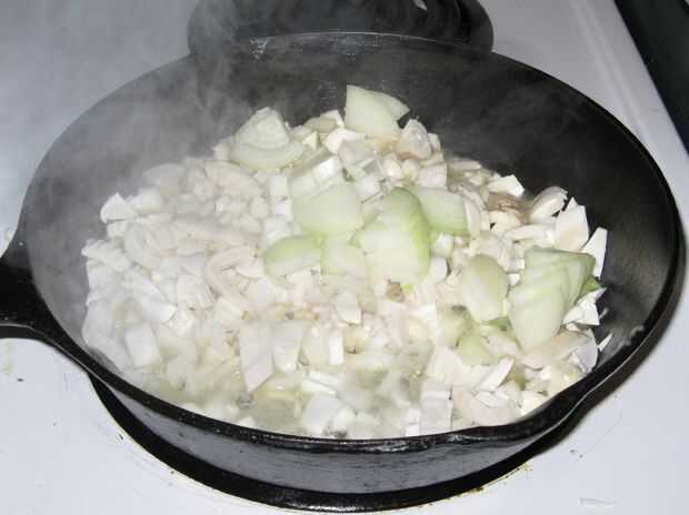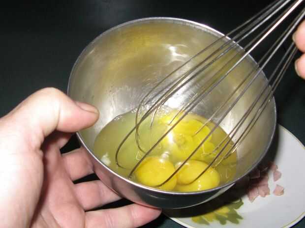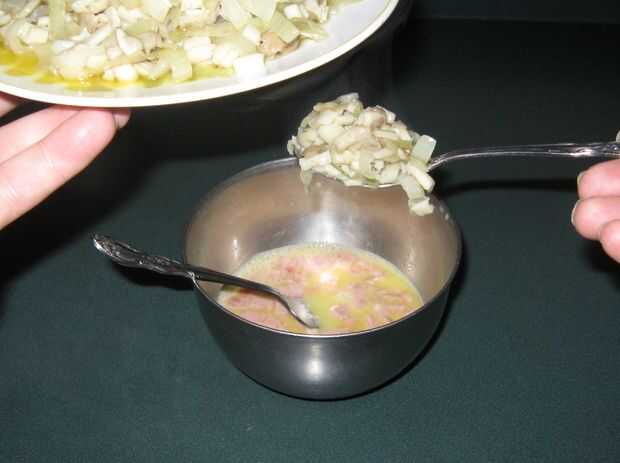 Añadir una cucharada picada de jamón y una cucharada de los champiñones salteados y cebollas para cada huevo.