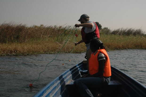 Redes pueden ser eficaces en las áreas donde tilapias nidos, que son fáciles de identificar. Un nido de tilapia se ve como un volcán de lodo o caldera a veces hasta metro a través. En la foto, estamos creando redes para recoger invasora tilapia del Nilo en el río Kafue, en Zambia.