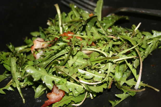 Aquí marchita los verdes. Marchitez de ligeramente parece sacar un poco de la amargura y hace una especie de aderezo. Tomar los trozos de tocino de la sartén, escurrimos un poco y luego mezclar con los diente de León verdes. Moler un poco de pimienta fresco y dar a tu ensalada poco extra zing.