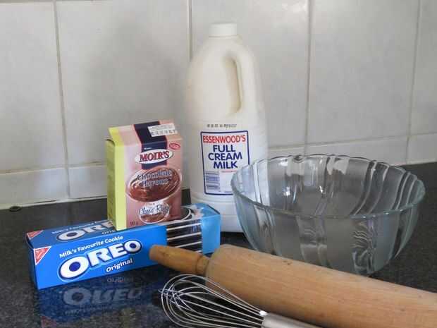 Otros elementos necesarios: olla de terracota, taza, mezcla bowl, wisk, perno de balanceo (u otro objeto para triturar galletas Oreo) y bolsa sándwich pequeño.