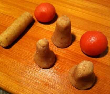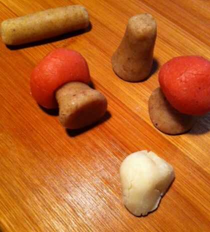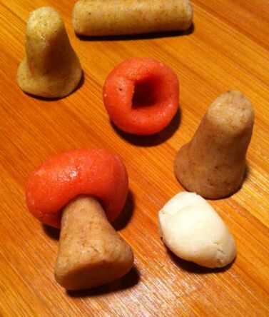 - La cabeza de hongo se forma introduciendo un dedo en una bola roja y formando la masa alrededor de.