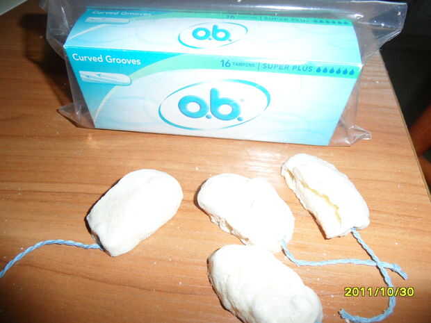 4. forma había batida blanco como tampones O.B.. Poner una cuerda o un hilo en la parte posterior del tapón. Repita este paso hasta usas nata blanco.