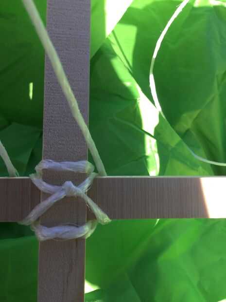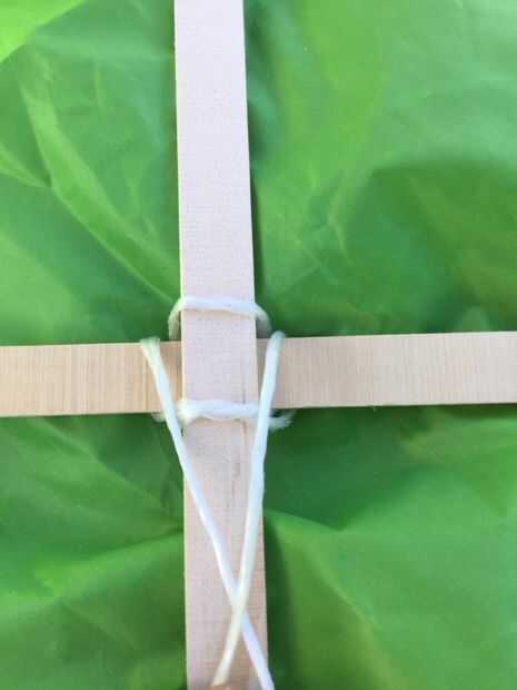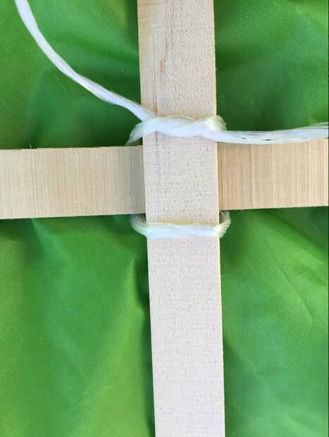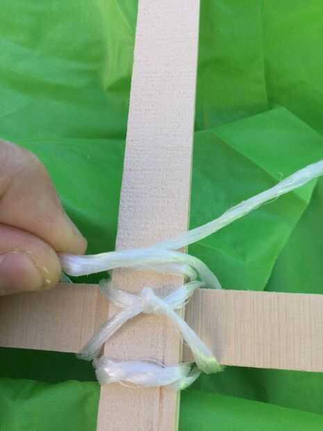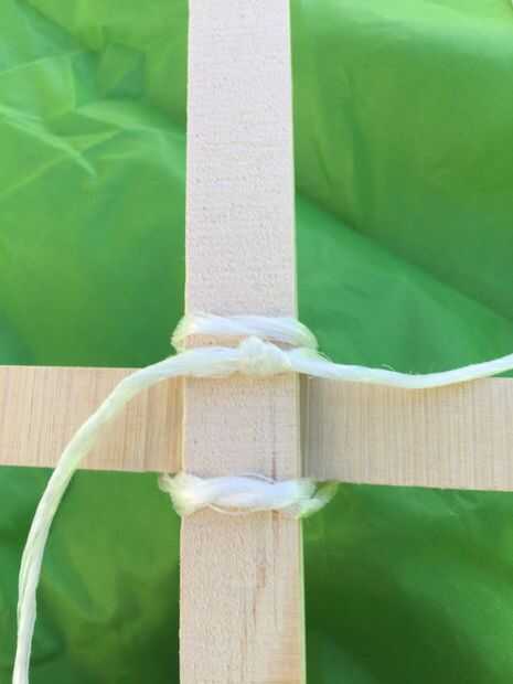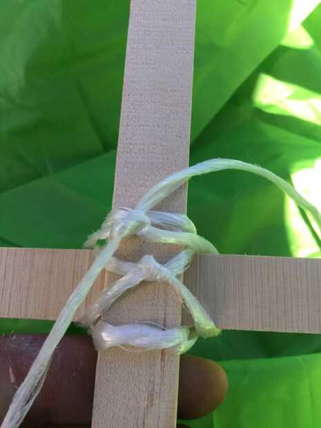 Ahora tiempo para atar el marco. Mira las fotos de cómo atarla. Quiere atar la Cruz cerca de dos tercios de la manera del palillo para arriba.