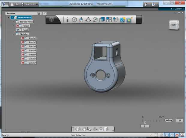 Cuando los generadores llegaron, utilicé mis pinzas para medirlas y creó una bancada en CAD utilizando libre software 123D de Autodesk. He añadido un agujero para un tornillo de ajuste fijar el soporte a la viga de madera de balsa de 1/2 pulgada y añadí dos orificios para tornillos que sujetan en la cara del motor. Comencé dibujando mi diseño en un papel y escribir todas las dimensiones críticas, luego ponerlo en el ordenador era realmente rápido y fácil. No olvide guardar a menudo sin embargo, puesto que en este momento 123D está todavía en desarrollo y ha colgado un par de veces me. He añadido unos 0,01" de espacio libre en las dimensiones críticas para asegurarse de que las cosas no fueron demasiado ajustadas.