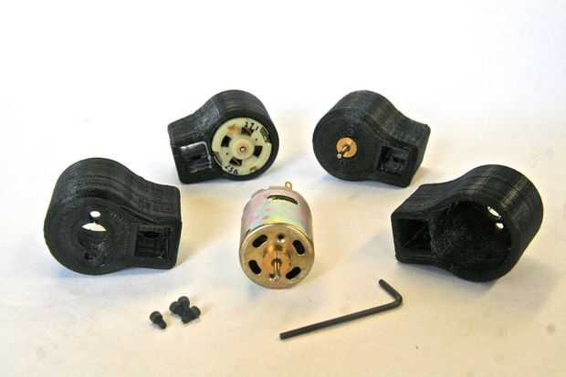 Impreso en una impresora 3D de PLA, un plástico biodegradable de maíz-basado de la impresora serie 1 hecho por las máquinas de tipo A y las piezas salieron grandes. Hacía bastante sólido, con 4 capas sólidas y perímetros y relleno 60%. Los generadores de caben comodamente y fueron asegurados en su lugar con tornillos de máquina pequeña en la parte delantera. El agujero para el tornillo de ajuste era apenas el tamaño correcto para el tornillo cortar su propia rosca sin partir las capas de plástico separadas. Usé un pequeño archivo para suavizar la apertura de la madera de balsa y que encajan perfectamente.