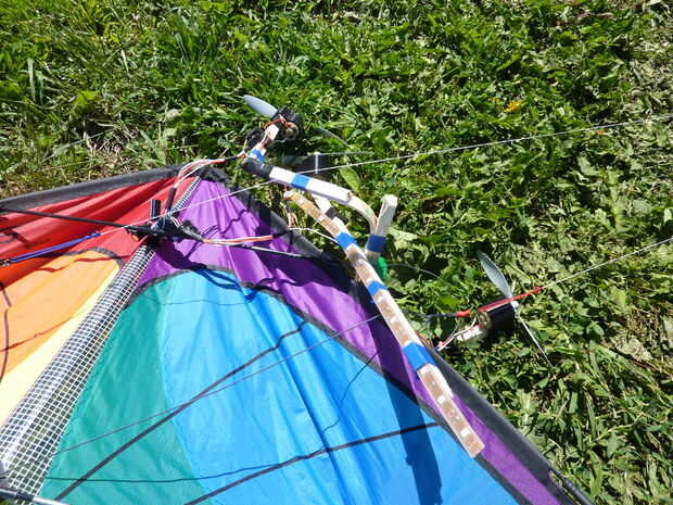 Al volar, los cuatro propulsores haz girar muy rápido y los LEDs se encienden cuando los condensadores han cargado para arriba. Maneja bastante bien y sin duda llama la atención en la playa! No le gusta golpear la tierra sin embargo. He modificado mi diseño para manejar impactos mejor agregando una sección flexible para cada una de las dos vigas de madera.