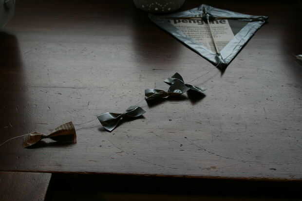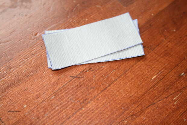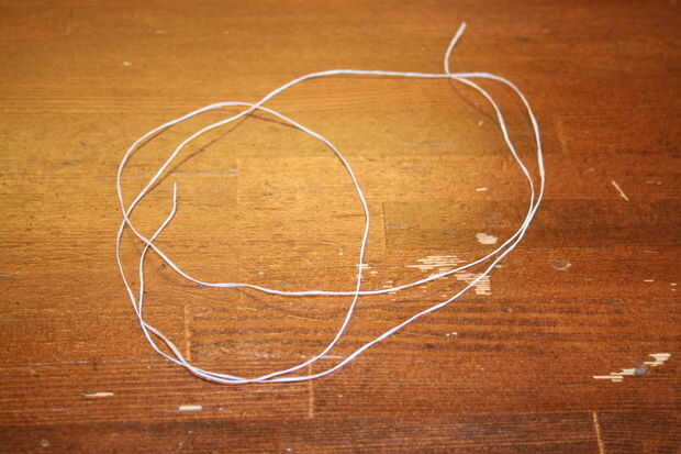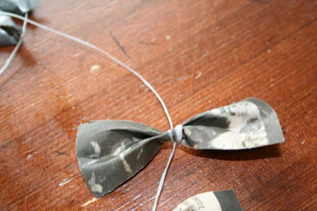 Cortar un trozo de cuerda (unos 57 cm. / 22.4"). Ahora corte algunas plazas de la tela (7 cm por 3 cm / aprox. 2,8" por 1,2"). Entonces les aplasta para que tipo de parecen una pequeña corbata de lazo. Hacer cuatro de estos con sobre 7 cm/2,8 "espacio en el medio.