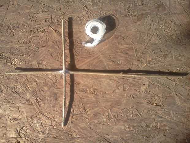 cuando ha recogido de sus materiales de cinta los dos palos juntos para hacer una cruz.