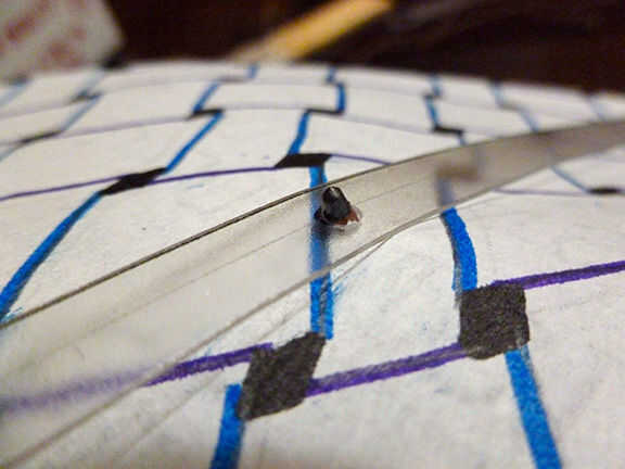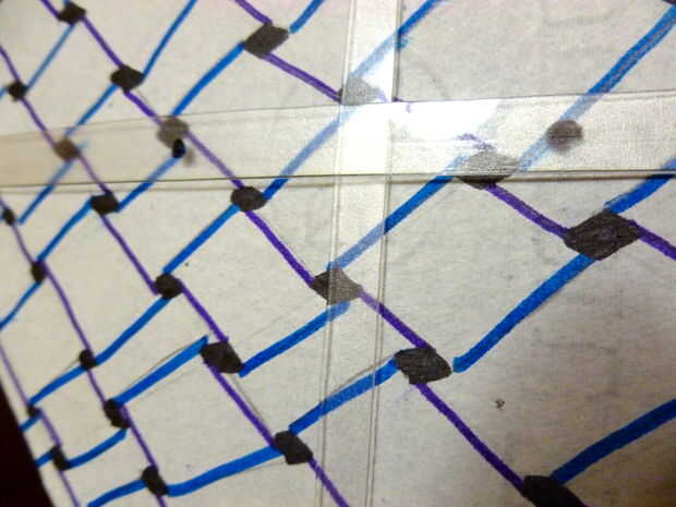 Ahora, los ponen a través de su cometa. Buscar en donde la horizontal (a través) de la tira coincide con la vertical (arriba y abajo) tira. A partir de la franja horizontal, medida a 1-2 pulgadas por encima en la tira vertical. Marca ese punto con un punto de marcador. Luego, ir abajo de la franja horizontal y marca con un punto también. Ahora, toma la perforadora y perfore los puntos en su franja vertical. Utilizando un lápiz, hacer un agujero en el papel donde los agujeros en la tira vertical se alinea.