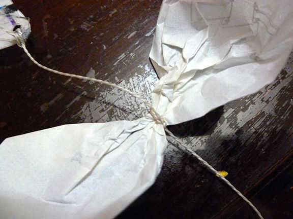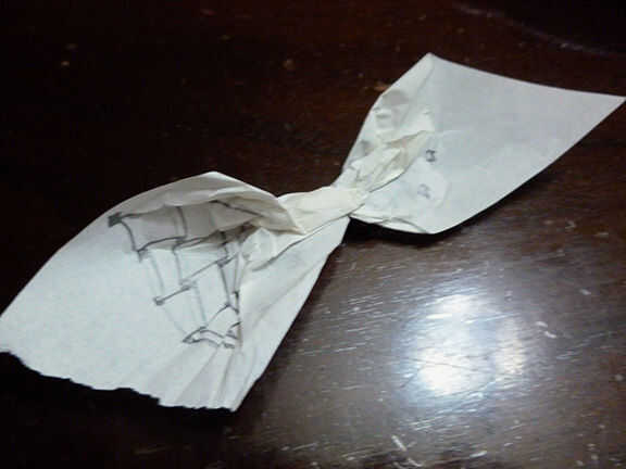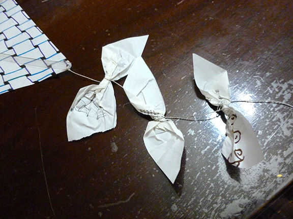 Una vez que tienes tu cola en el cometa, ahora usted puede Agregar las "plumas de la cola." Estos hará que el viento atrapar en la cometa y volará mejor. Usando su esquina desechos de corte de la cometa inicial, gire por separado los documentos en el centro. Ahora debe tener 3 o 4 pedazos de papel en forma de pajarita. Utilizando la cadena de la cola, uno por uno atar en las plumas utilizando la cadena. Atarlos en el centro. No necesita cuerdas extra otros luego su cola.