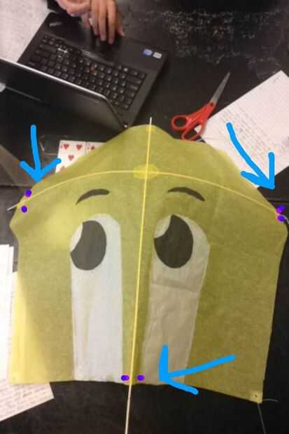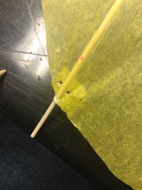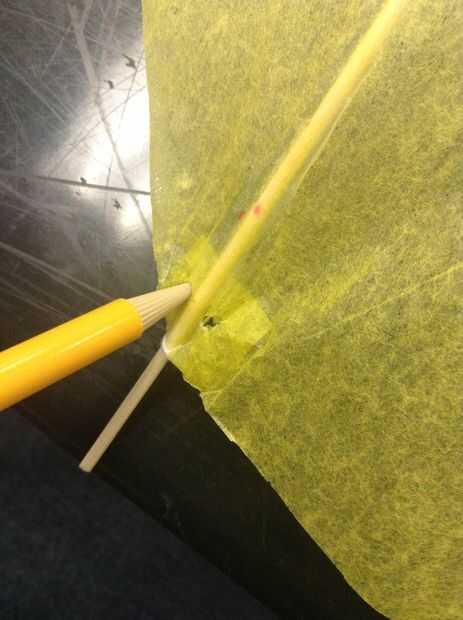 Deja la cometa flexionada y utilizar el lápiz para empujar dos agujeros como cerca del mástil que pueda, en 3 lugares. 1 en cada extremo de los largueros horizontales y uno en la parte inferior de los largueros verticales en la vela amarilla. Corte tres piezas de cadena que son cerca de 30 pulgadas de largo. Tome un extremo de la cuerda y meter en uno o el todo de la parte superior. Entonces curva encima y empujar hacia arriba a través del otro agujero en el otro extremo de los largueros. El empate al final de la cadena con el resto de la pieza. Repita el procedimiento en todos los 3 puntos de la cometa.