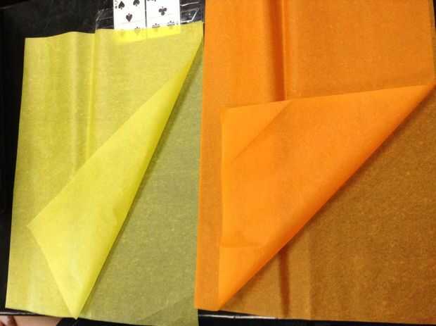 Doblar las piezas de papel de seda amarillo y naranja por la mitad (tipo hamburguesa)