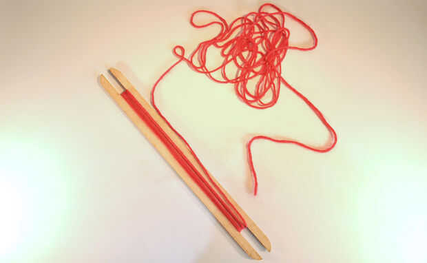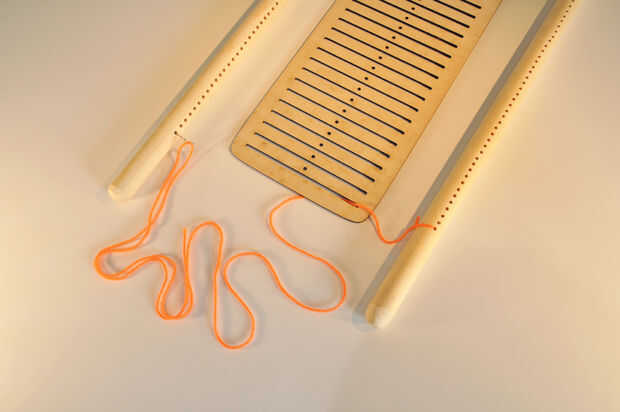 Ahora pasar el hilo de la primera línea cortada fuera de la malla de lizo. Fije el hilo con un nudo en el primer palillo. Luego pásela a través del primer agujero del segundo palo. Repita este procedimiento para cada hoyo y cada línea cortada fuera de la malla de lizo.