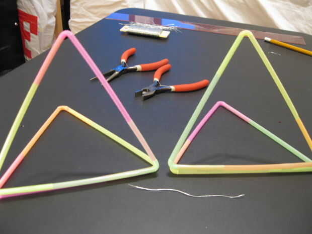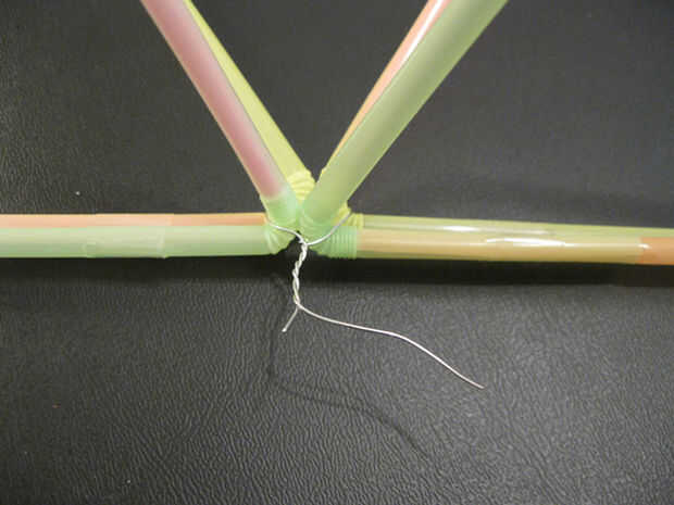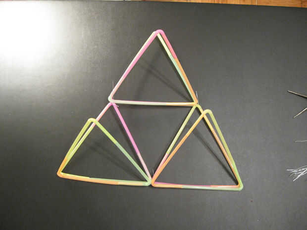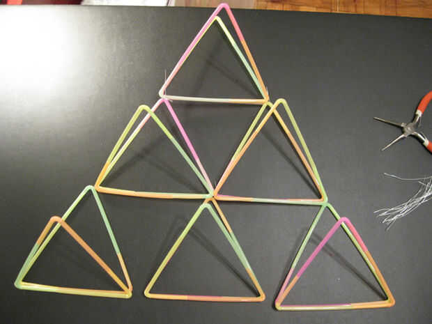 Hacer primero la parte inferior de la cometa. Conectan varias células tetra girando 3" trozos de alambre. Enganche los extremos torcidos usted va obtener asomó más adelante si no. Mantenga la conexión, haciendo un triángulo más grande fuera de las células pequeñas. Yo recomiendo usar 3 o 4 filas como se muestra.