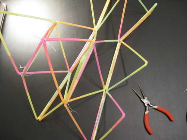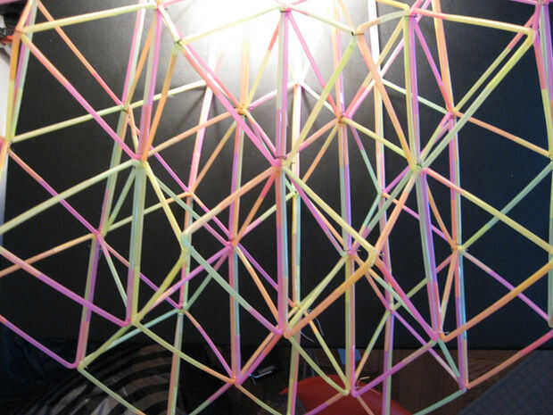 se trata de una cometa tetraédrica de 10 células, basada en el diseño de paja flexible de emilyfis.Materiales: (La mayoría normalmente se puede comprar en una tienda de dólar)Pajas flexiblePajitas rectasCinta de embalajeCinta Scotch4" mini abrazadera
